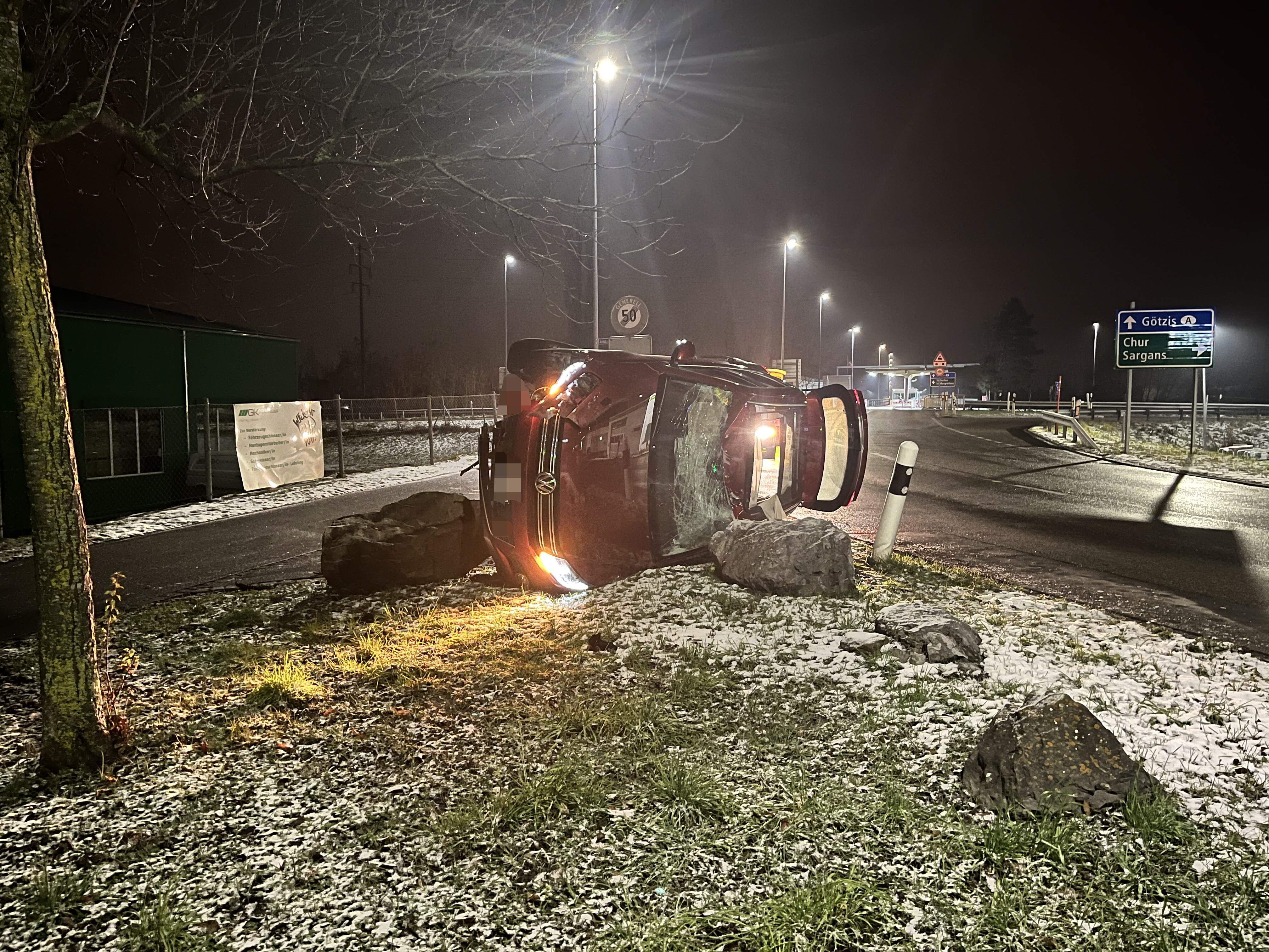 Kriessern SG – Auto landet nach Kollision mit Findling auf der Seite – Fahrer alkoholisiert