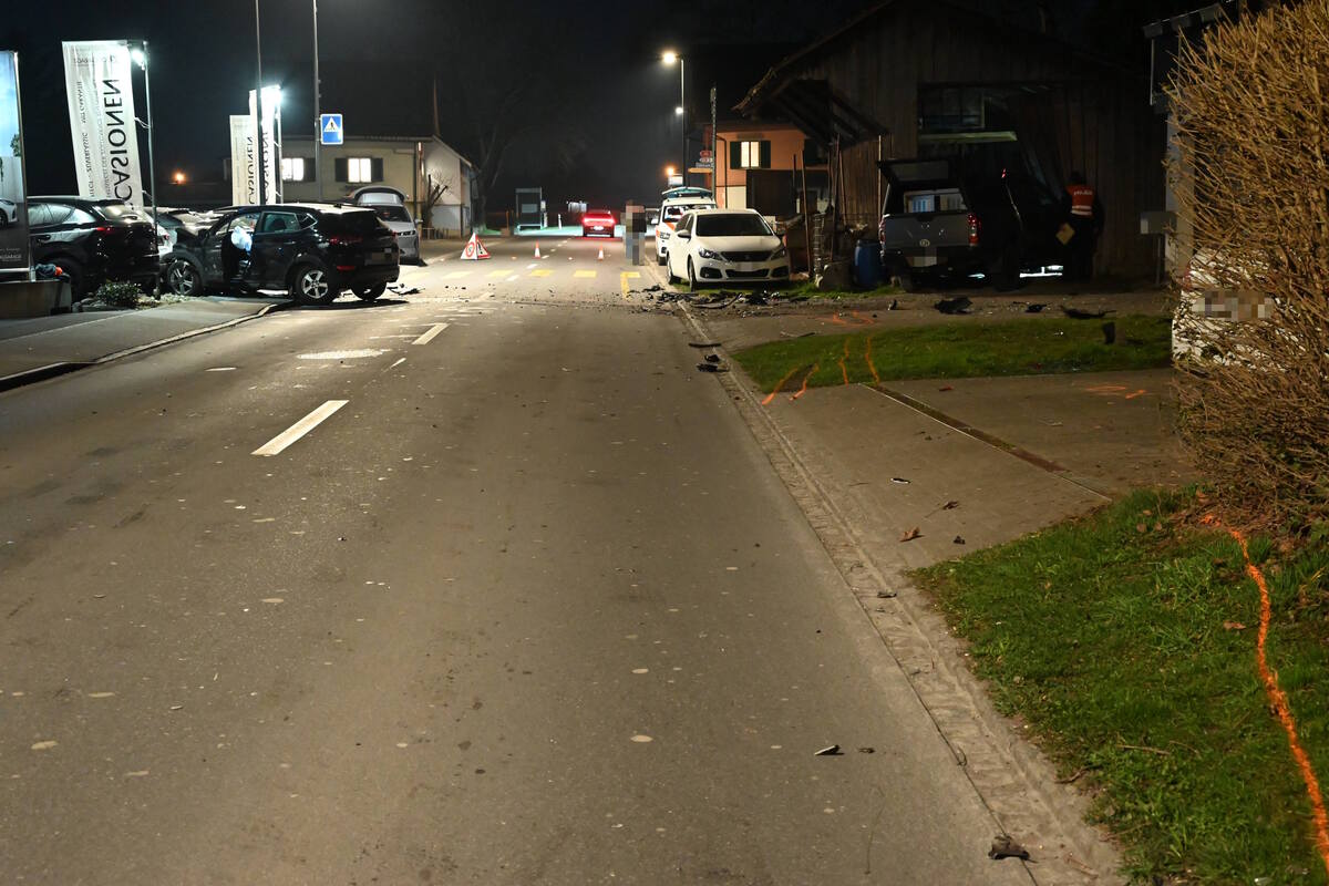 Dadurch wurden beide Autos auf die Seite abgewiesen und prallten in diverse parkierte Autos. Eines der parkierten Autos wurde in eine Scheune gestossen, welche ebenfalls beschädigt wurde.