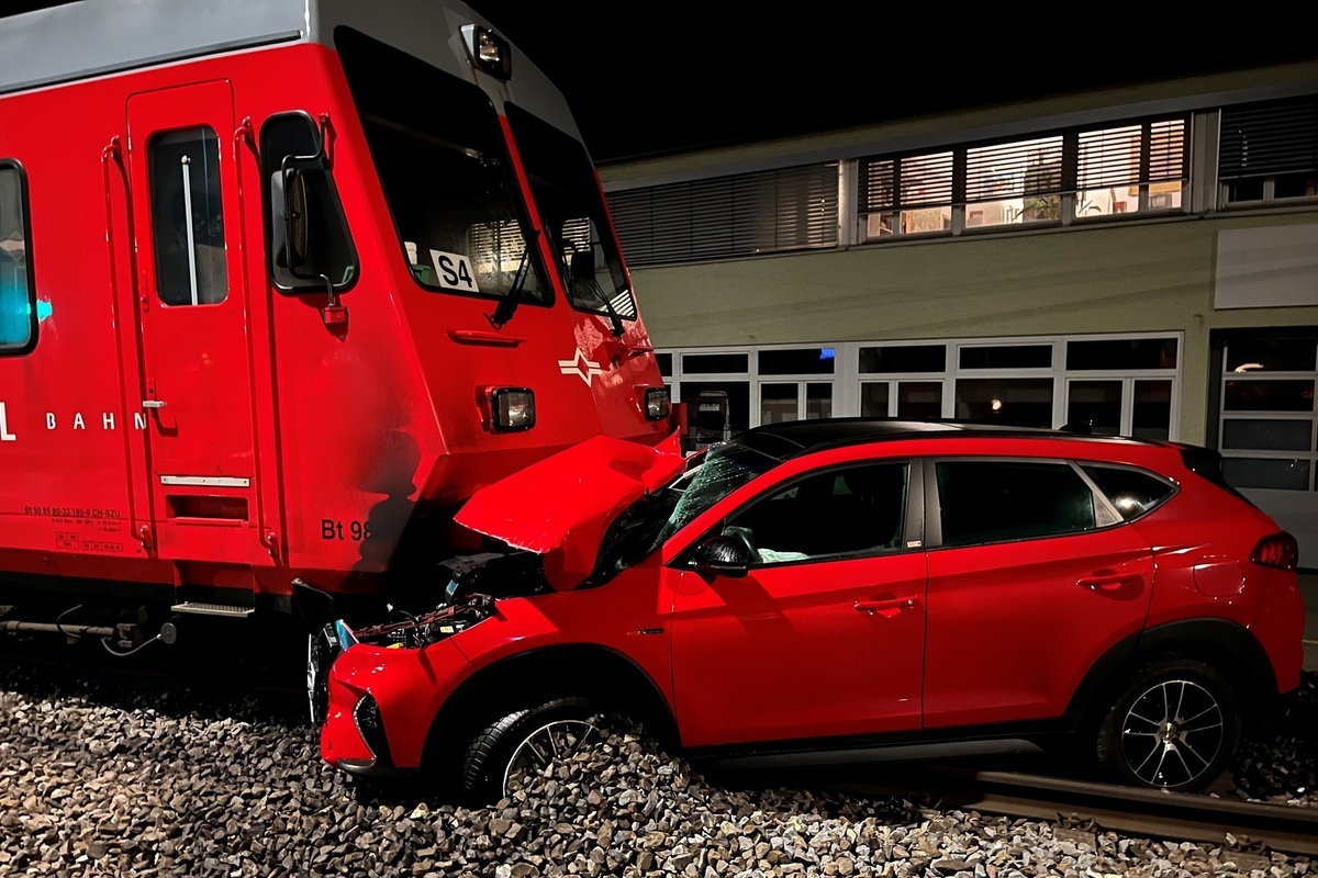 Bei einem Verkehrsunfall zwischen einer S-Bahn der Linie 4 der SZU und einem Auto entstand am Samstagnachmittag (30.12.2023) in Langnau a.A. erheblicher Sachschaden. Verletzt wurde niemand.