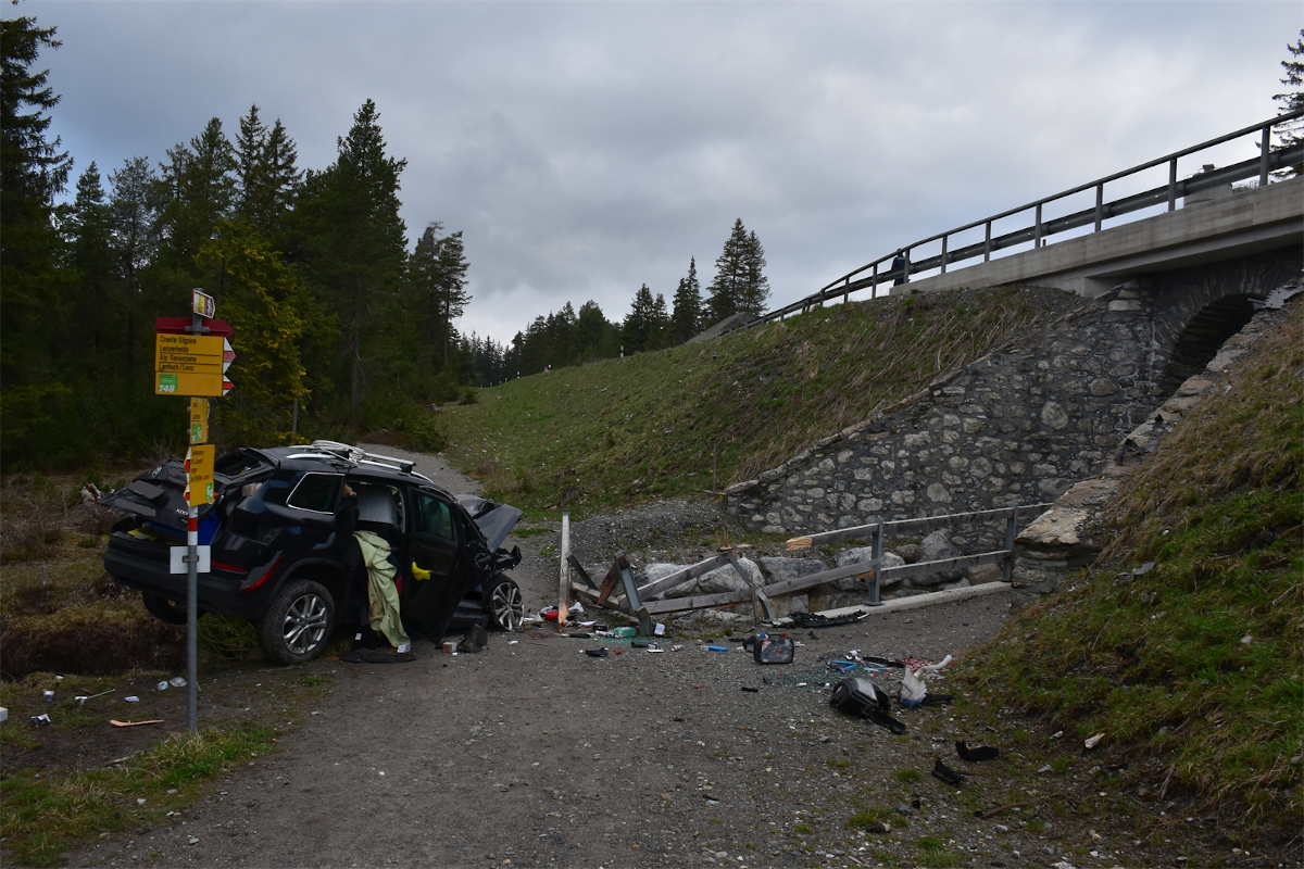 Es stellte sich heraus, dass der 27-jährige Fahrzeuglenker um Mittennacht auf der Julierstrasse H3a von der Lenzerheide kommend in Richtung Lantsch / Lenz fuhr. Auf einem geraden Streckenabschnitt gelangte sein Fahrzeug an eine, am rechten Fahrbahnrand, im Boden eingelassene Leitschranke einer nachfolgenden Brücke. Der Personenwagen wurde durch die Leitschranke in Richtung Abgrund angehoben und stürzte folglich auf den darunterliegenden Wanderweg. Der Lenker erlitt unbestimmte Verletzungen und das Fahrzeug wurde infolge des massiven Aufpralls völlig demoliert. Der Fahrzeugführer wurde durch die Alpine Rettung erstversorgt und mittels der Rettung Mittelbünden ins Kantonsspital Chur überführt. Beim Lenker wurde eine Blutprobe durchgeführt.