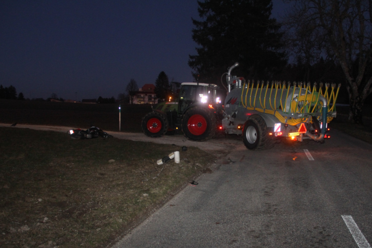 Da er das Manöver des landwirtschaftlichen Fahrzeugs zu spät bemerkte, versuchte der Motorradfahrer, nach links auszuweichen.