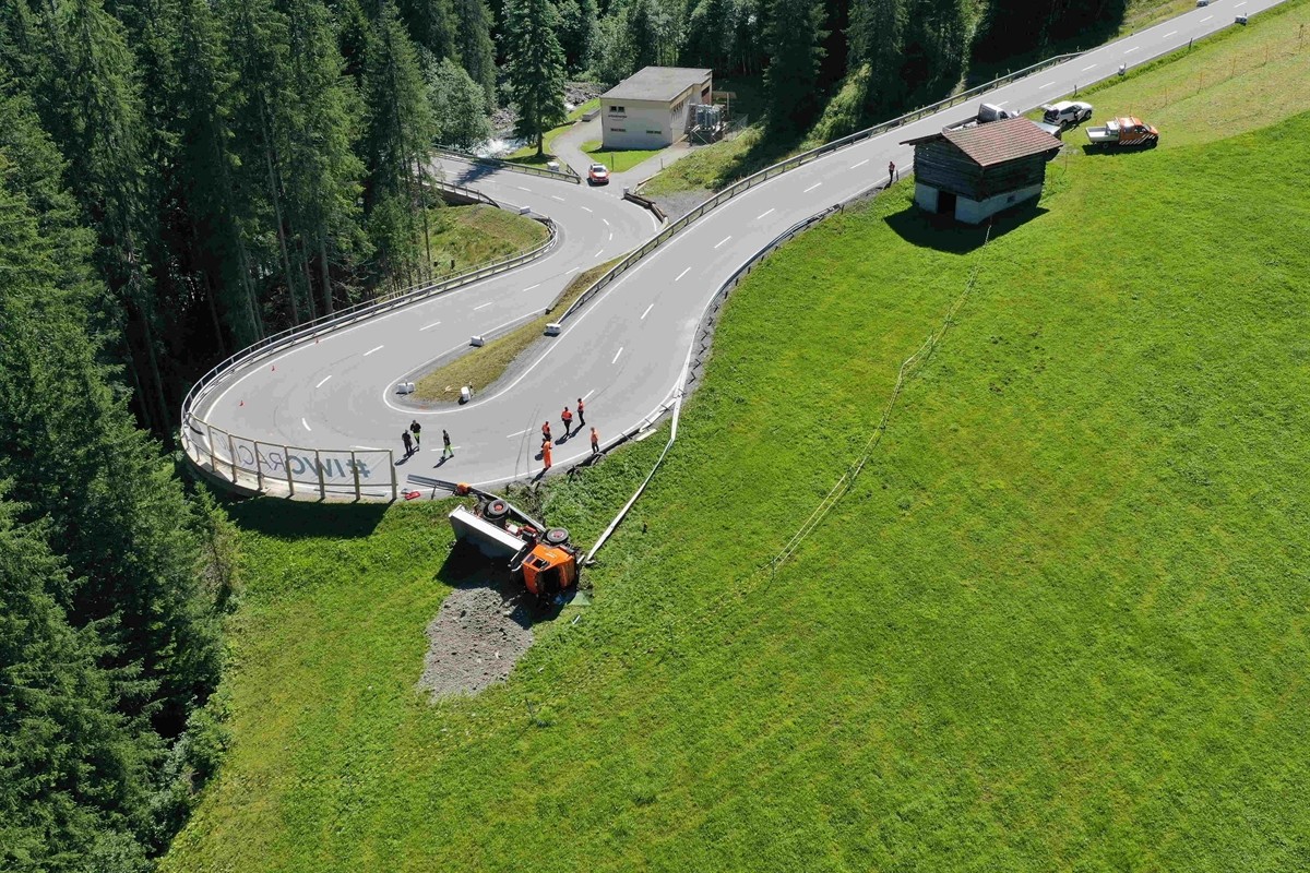 Der 35-jährige Chauffeur fuhr am gestrigen Mittwoch kurz vor 11 Uhr von Arosa kommend unterhalb Litzirüti talwärts. In einer Rechtswendekehre kollidierte sein Lastwagen mit der linksseitigen Leitplanke, durchbrach diese und kippte im angrenzenden Wiesland auf die rechte Fahrzeugseite.