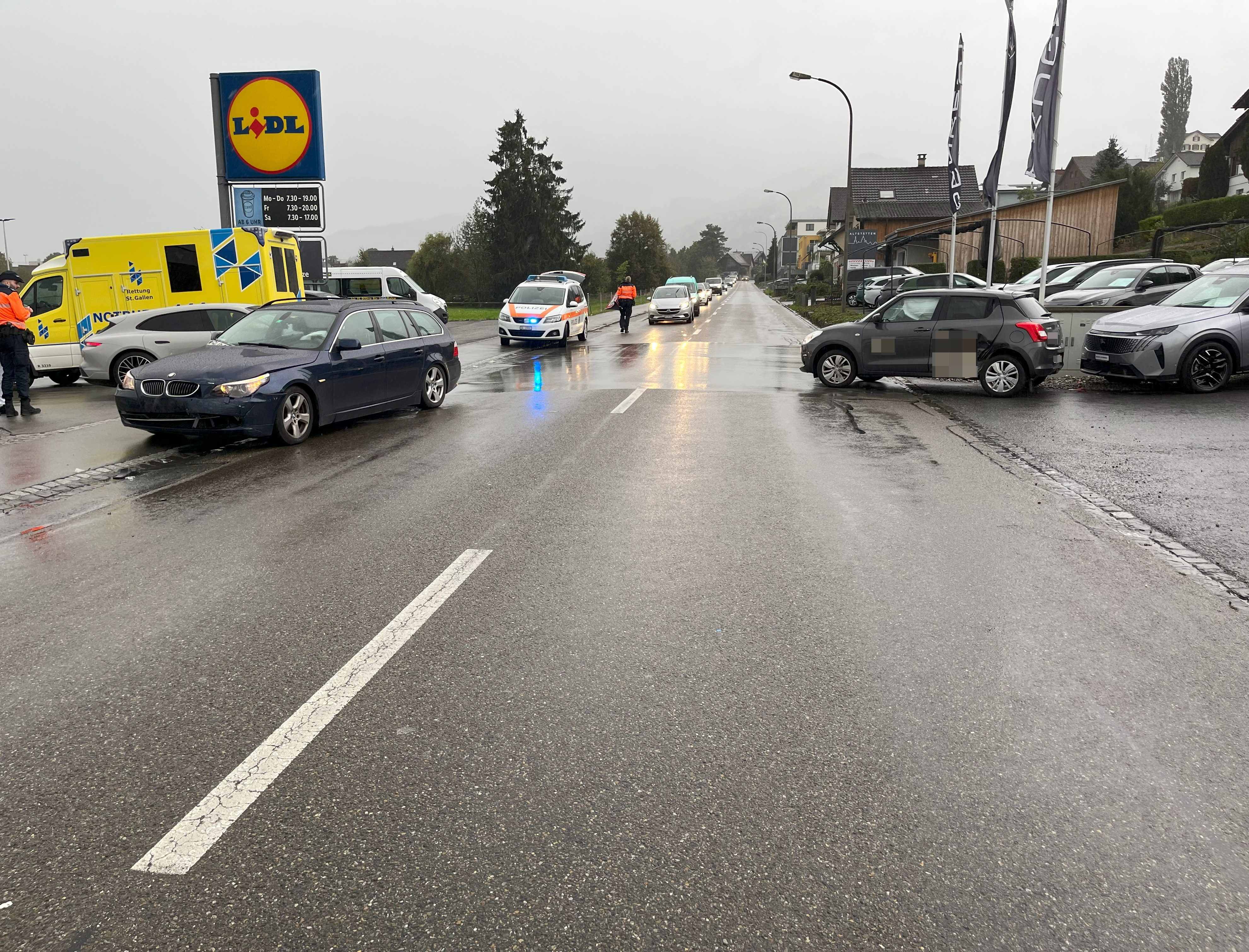 Eine 49-jährige Frau fuhr mit ihrem Auto bei der Verzweigung 'Gehrenhof' links in die Rorschacherstrasse ein. Gleichzeitig fuhr ein 40-jähriger Mann mit seinem Auto von Altstätten her in Richtung Heerbrugg. Es kam zur Kollision zwischen den beiden Autos. Durch den Aufprall drehte sich das Auto der Frau um 180 Grad über die Strasse. Dort prallte es in ein parkiertes Auto.