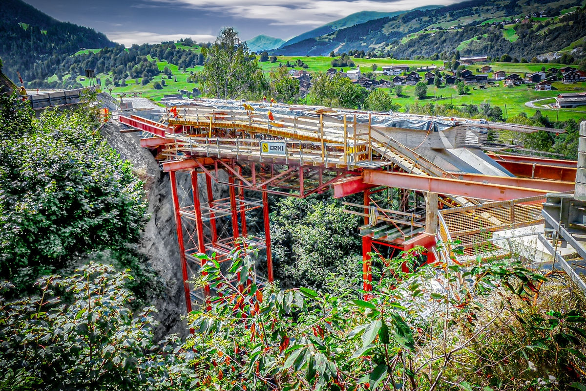 Die neue Brücke überspannt die Val da Tersnaus zwischen zwei steilen Felswänden mit einer eleganten Sprengwerkskonstruktion aus Stahlbeton. Diese ermöglicht eine filigrane Bauweise trotz der grossen Spannweite von knapp 48 Metern.