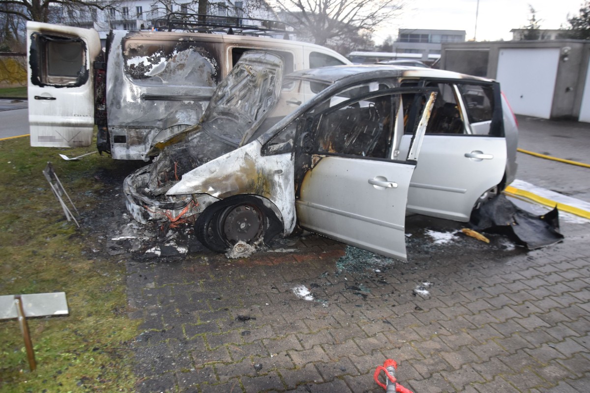 Luterbach SO – Neben dem in Brand geratenen Auto parkierte Fahrzeuge fingen ebenfalls Feuer (Kantonspolizei Solothurn)