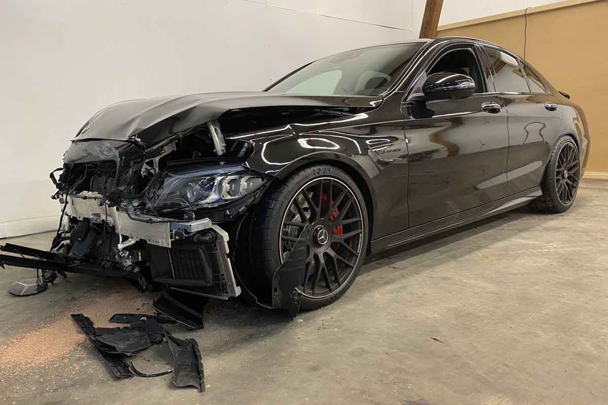 seinem Mercedes AMG C63 S aus dem Kreisel auf der