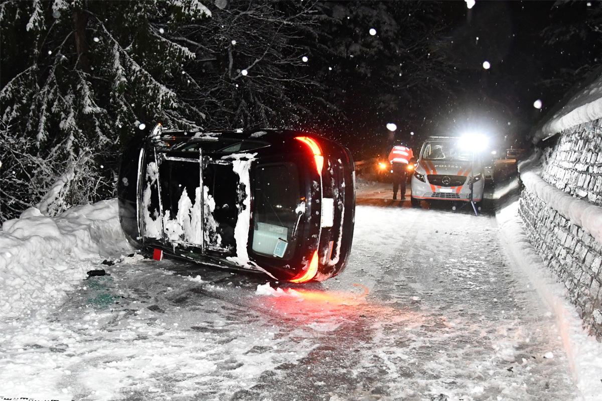In einer leichten Linkskurve geriet das Fahrzeug auf der schneebedeckten Strasse ins Rutschen, kollidierte mit der rechtsseitigen Stützmauer, kippte auf die Fahrerseite und kam dann zum Stillstand.