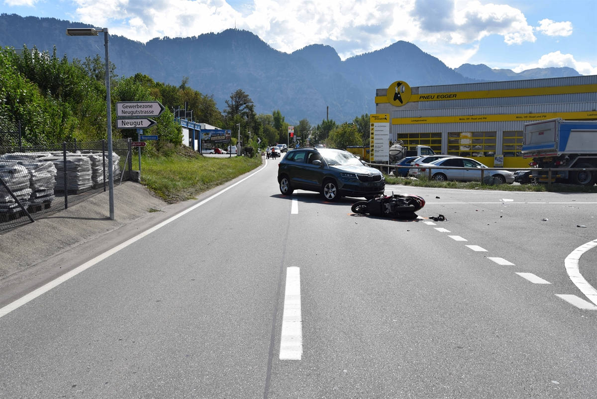 Ein 22-jähriger Personenwagenlenker aus Australien fuhr um 11.40 Uhr auf der Hauptstrasse von Landquart in Richtung Maienfeld. Als er nach links in die Neugutstrasse abbog, kollidierte er mit einem entgegenkommenden Motorrad.