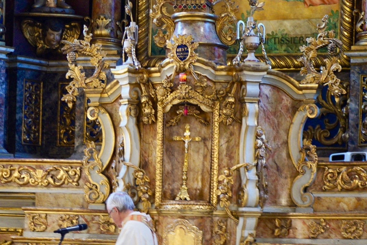 die Person das auf dem Altar abgelegte Kreuz mit sich.