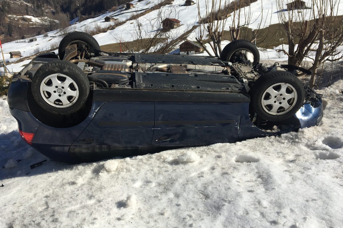 Im Schnee überschlug sich der Personenwagen und kam auf dem Dach liegend, abseits der Strasse, zum Stillstand. Beim Unfall wurde niemand verletzt. An der Strasseneinrichtung, dem Fahrzeug sowie dem Wiesland entstand Sachschaden.