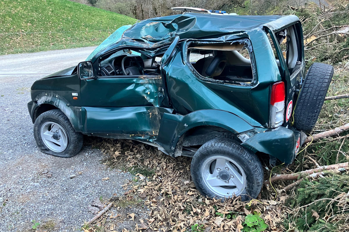 Am Mittwochnachmittag furh ein 93-jähriger Fahrzeuglenker auf den Weissenbergen auf dem Fahrweg allein mit seinem Personenwagen bergwärts, als ihm ein talwärts fahrendes landwirtschaftliches Fahrzeug entgegenkam. Um kreuzen zu können, fuhr der Personenwagenlenker mit seinem Fahrzeug rückwärts zu einer linksseitigen Ausweichstelle. Dabei kam er bei der Ausweichstelle zu weit zum Hang, so dass das Fahrzeug überkippte und 80m weit sich überschlagend den Hang hinunterstürzte. Der Fahrzeuglenker wurde dabei aus dem Fahrzeug geschleudert.
