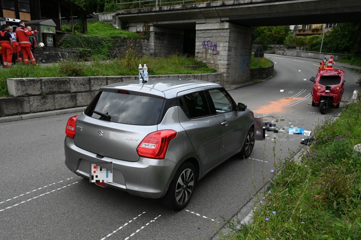 Kurz nach 17 Uhr fuhr ein 66-jähriger Mann mit einem elektrisch angetriebenen Lastendreirad auf der Burgstrasse abwärts Richtung Dorfstrasse. Aus derzeit ungeklärten Gründen geriet er im Bereich der Bahnunterführung auf die Gegenfahrbahn, wo er frontal mit dem entgegenkommenden Auto einer 68-jährigen Frau zusammenprallte.