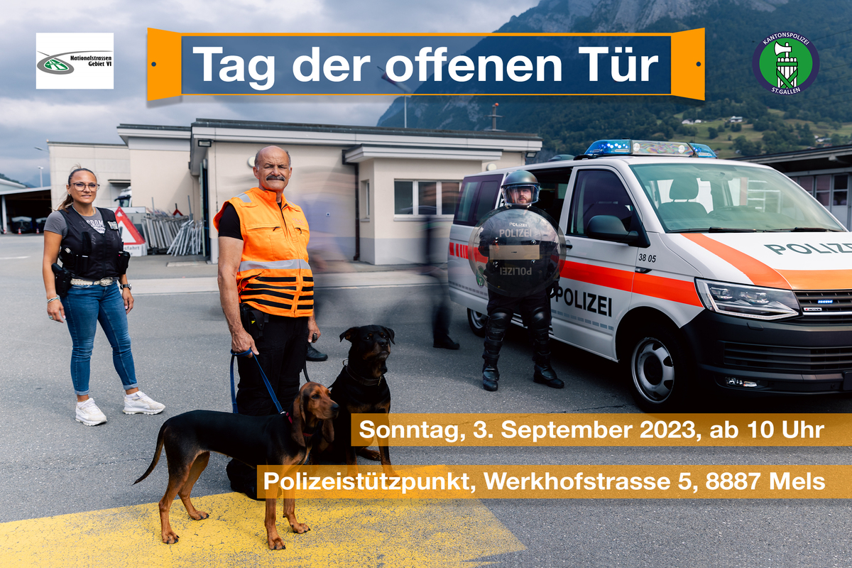 Am Sonntag (03.09.2023) wird auf dem Polizeistützpunkt sowie auf dem Werkhof in Mels der Tag der offenen Tür der Kantonspolizei St.Gallen und des Nationalstrassen Gebiets VI (GEVI) stattfinden. Von 10 Uhr bis 16 Uhr erhalten Interessierte Einblicke in die Arbeit und Organisation der Kantonspolizei St.Gallen und des GEVIs. Zudem sorgen packende Liveshows zu einem Vermisstenfall sowie der Interventionseinheit und den Diensthunden für ein actionreiches Erlebnis.