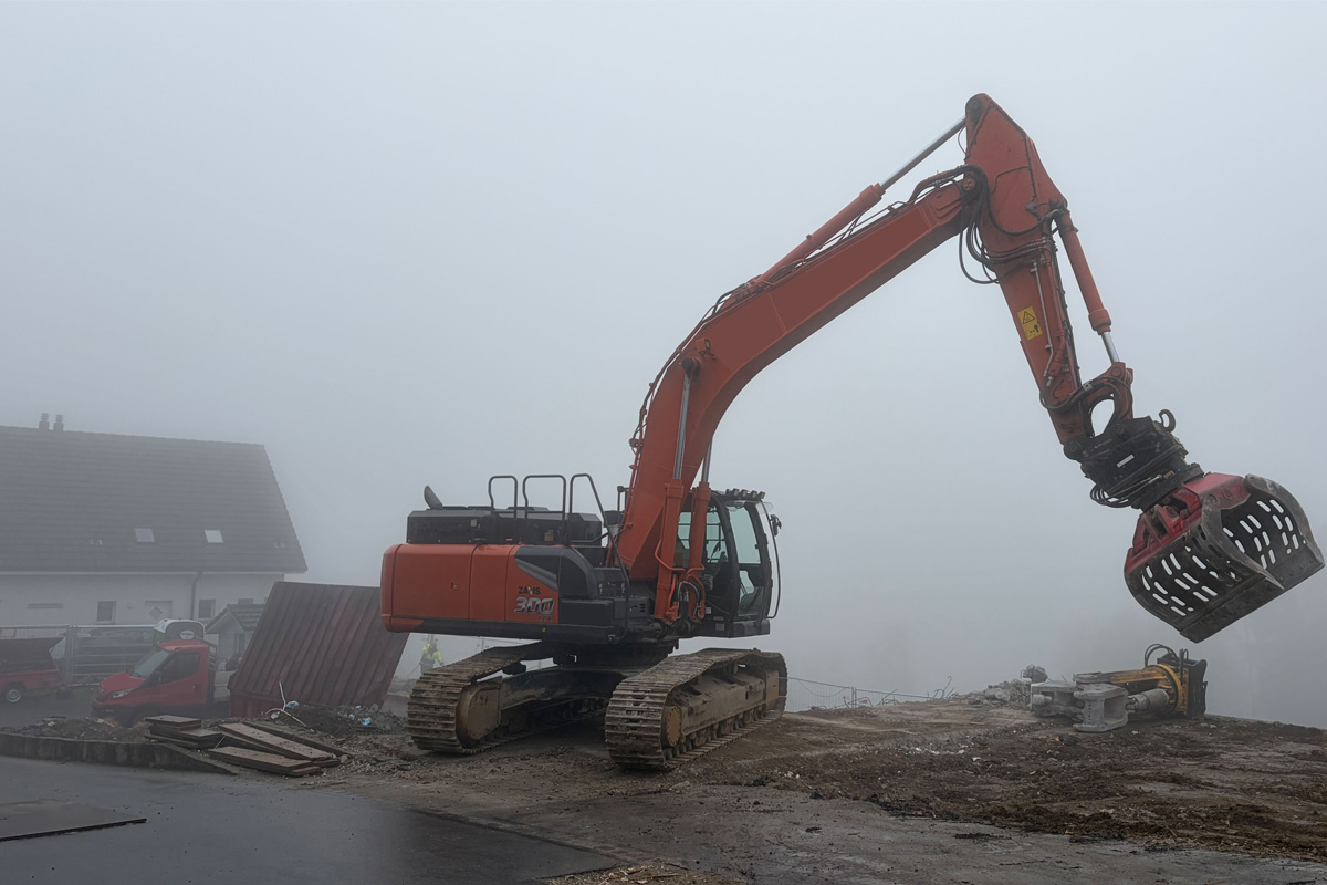 Bei Abbrucharbeiten an einem Gebäude wurde der 56-jährige Arbeiter von einem hydraulischen Sortiergreifer eines Baggers erfasst und im Bereich des Oberkörpers eingeklemmt.