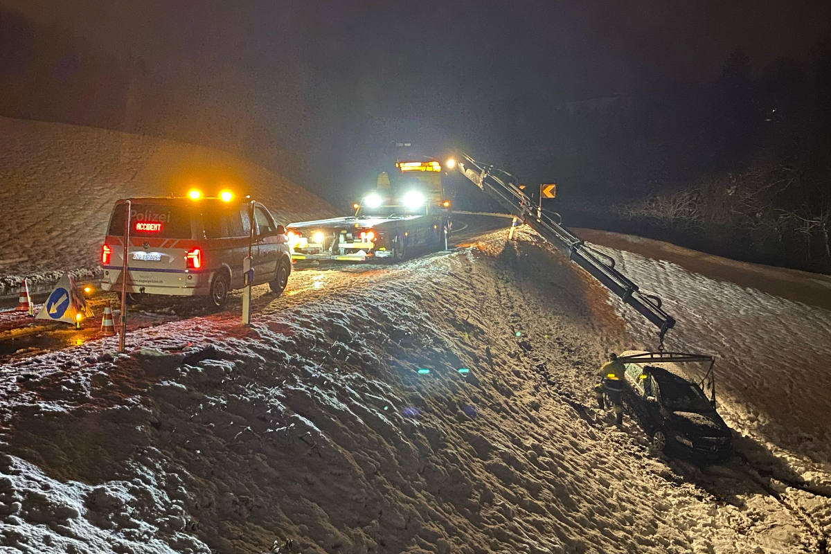 Ein Auto ist auf der schneebedeckten Strasse von der Fahrbahn gekommen und hat sich überschlagen. Die Lenkerin wurde leicht verletzt. Das Auto musste von einem Kran geborgen werden.