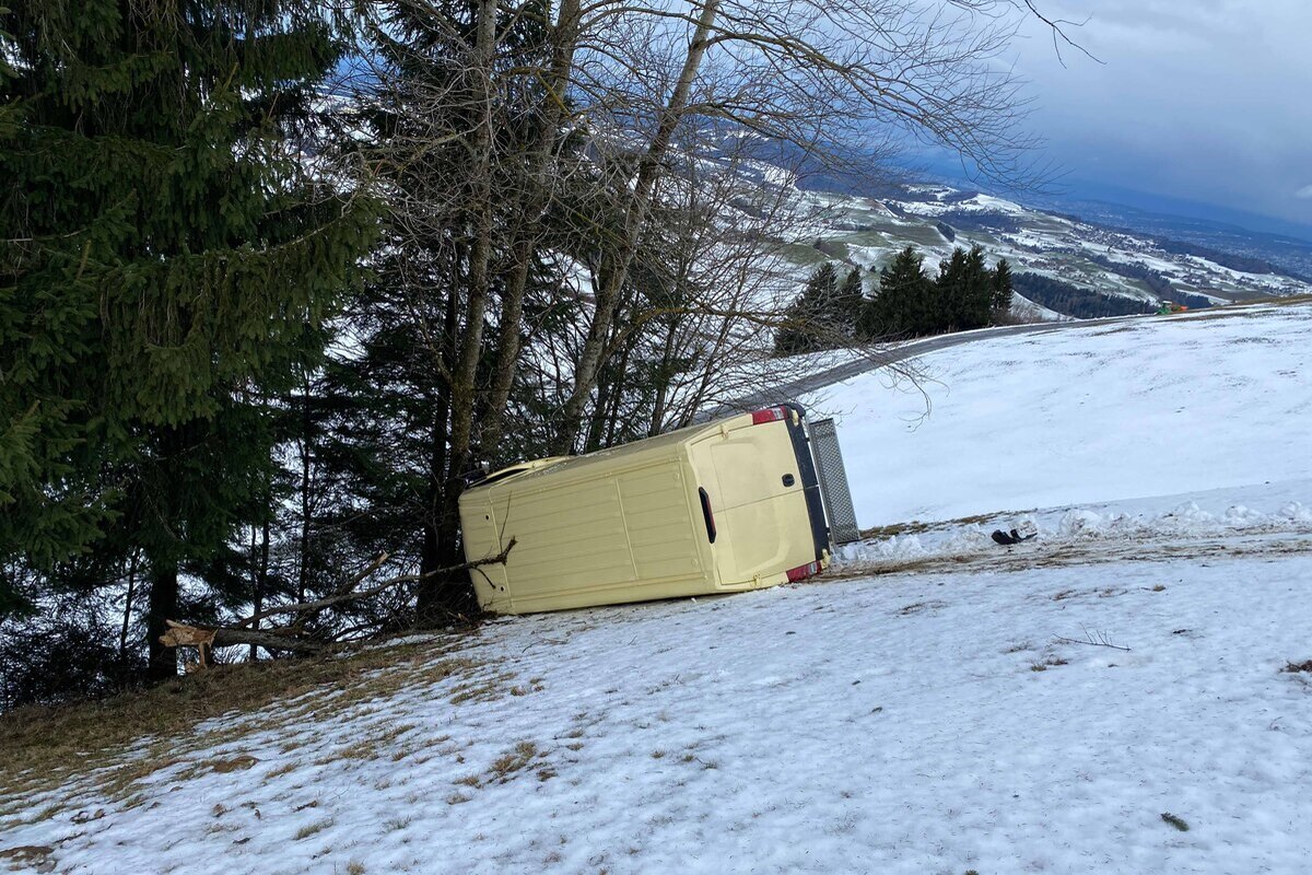 Bei winterlichen Strassenverhältnissen ist ein Lieferwagen von der Fahrbahn abgekommen und zur Seite gekippt. In der Folge schlitterte das Fahrzeug rund 60 Meter den Abhang hinunter, prallte in einen Baum und kam auf der Seite liegend zum Stillstand.