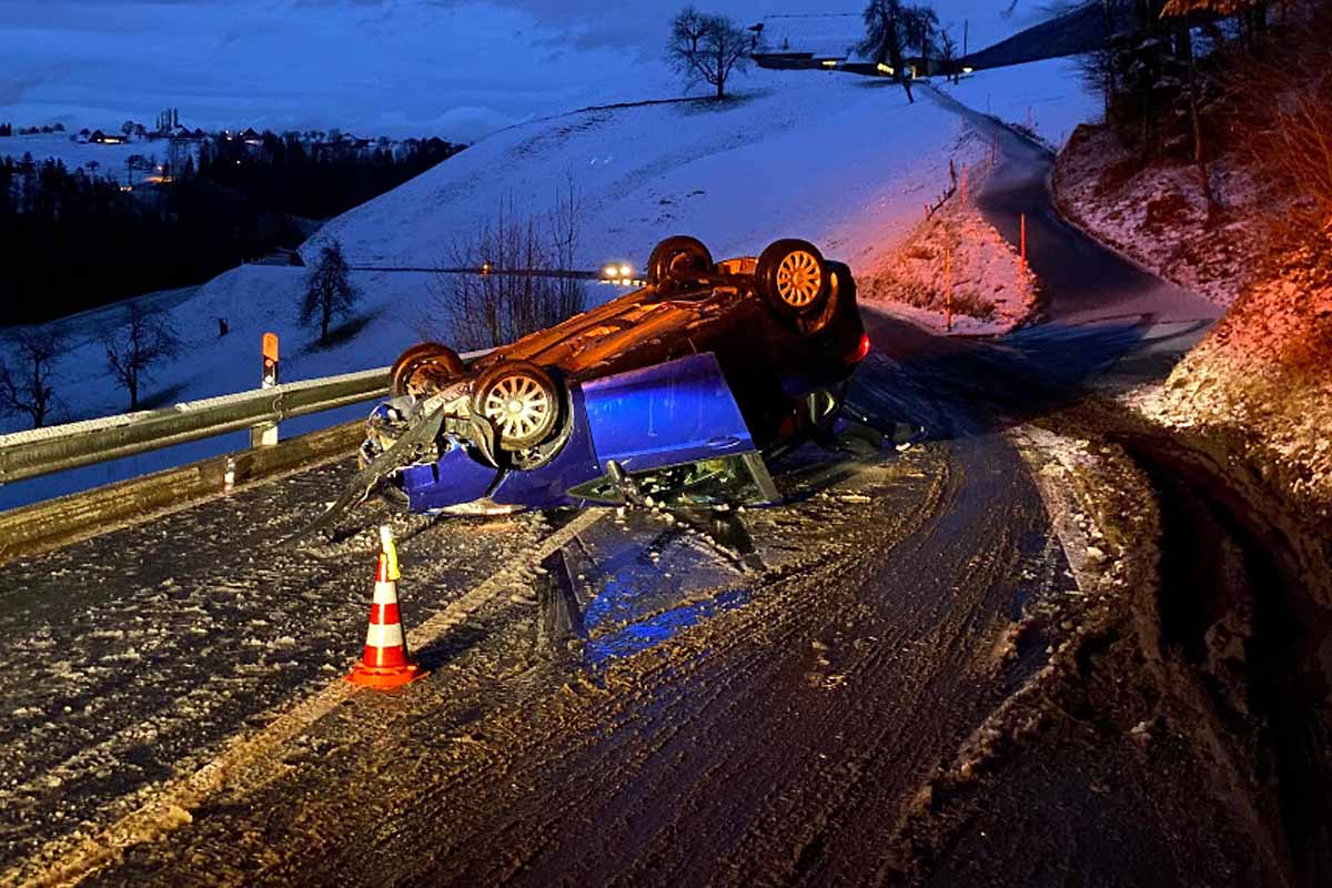 Auf der schneebedeckten Strasse ist ein Auto ins Schleudern geraten und auf dem Dach liegend zum Stillstand gekommen. Die Insassen kamen mit dem Schrecken davon.