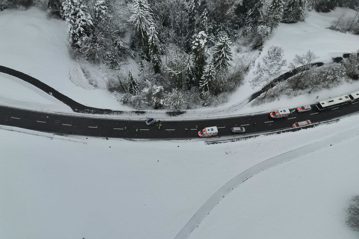 Infolge der Kollision prallten beide Fahrzeuge auf der rechten Strassenseite in eine Stützmauer. Eines der beteiligten Fahrzeuge wurde anschliessend über die Fahrbahn geschleudert und kollidierte auf der linken Seite zusätzlich mit einer Leitplanke.