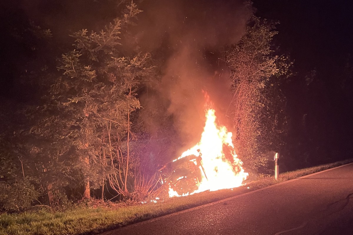 Mutmasslich durch übermässigen Alkoholkonsum kam ein VW-Lenker mehrfach von der Strasse ab. Bei einer Kollision mit dem Unterholz fing das Auto Feuer. Die beiden Insassen verletzten sich leicht.