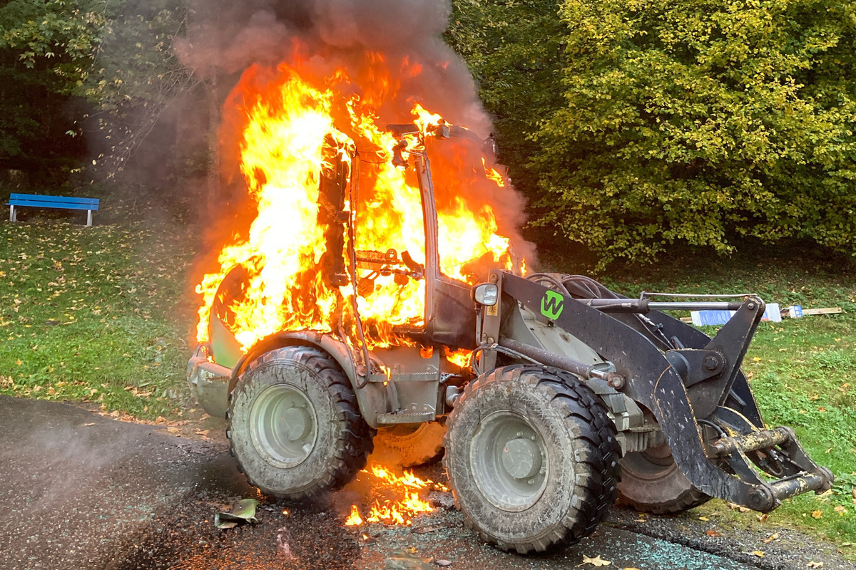 Aufgrund einer technischen Ursache geriet ein Pneulader auf der Bergstrasse unterhalb des Fachtwaldes in Brand. Der Chauffeur konnte die Baumaschine am Strassenrand abstellen und sie verlassen.
