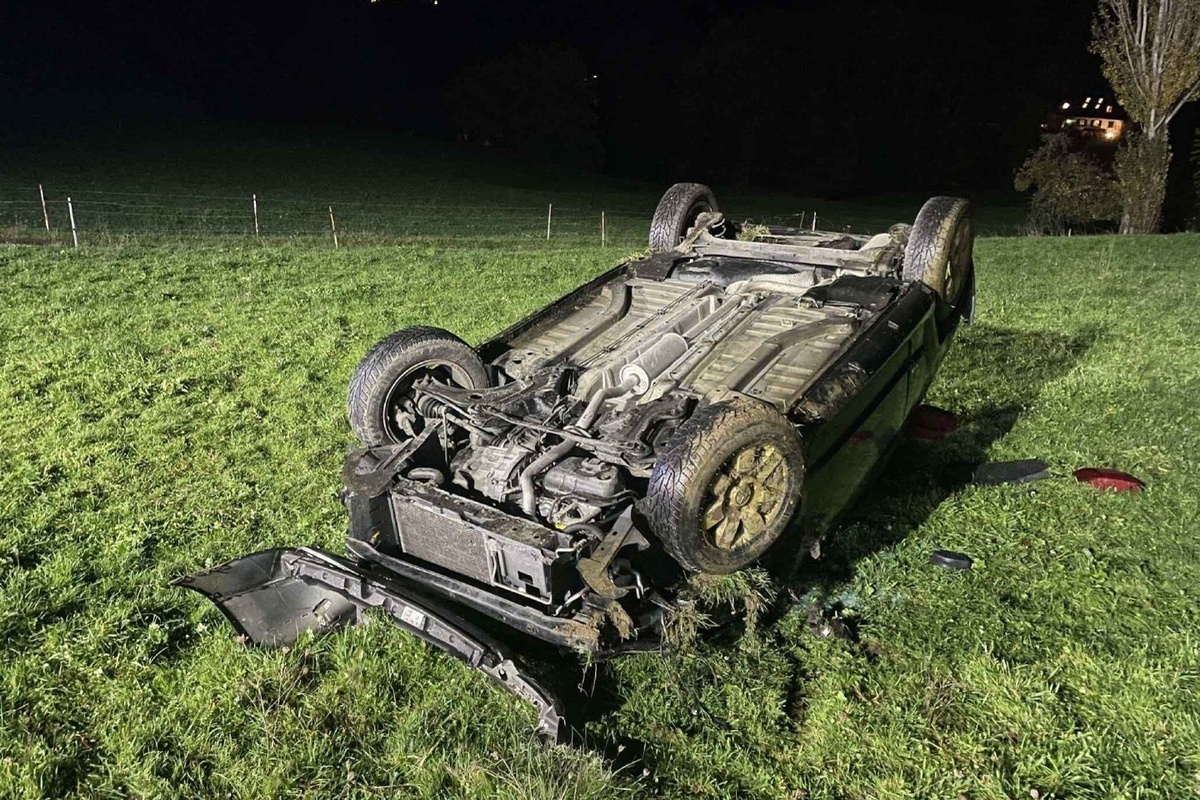 Eine Polizeipatrouille traf vor Ort ein und fand ein Auto auf dem Dach liegend in einem Feld. Der 36-jährige verletzte Fahrer konnte sich im Anschluss selbst aus dem Fahrzeug befreien. Eine Ambulanz brachte ihn zur Kontrolle ins Spital.