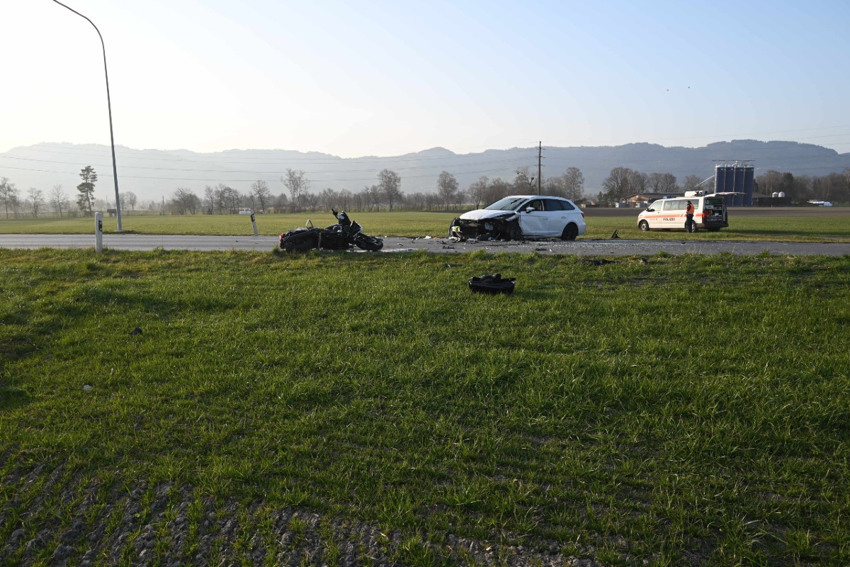 Am Montag (21.03.2022), um 16:15 Uhr, kollidierte ein Motorrad mit einem Auto. Ein 41-jähriger Motorradfahrer wurde dabei schwer verletzt und musste vom Rettungsdienst betreut und mit der Rega ins Spital gebracht werden.