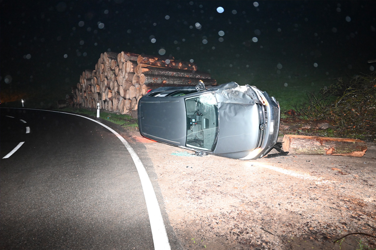Dabei prallte das Auto gegen einen Randleitpfosten und einen Holzpolter. In der Folge kam das Fahrzeug auf der rechten Seite liegend zum Stillstand.