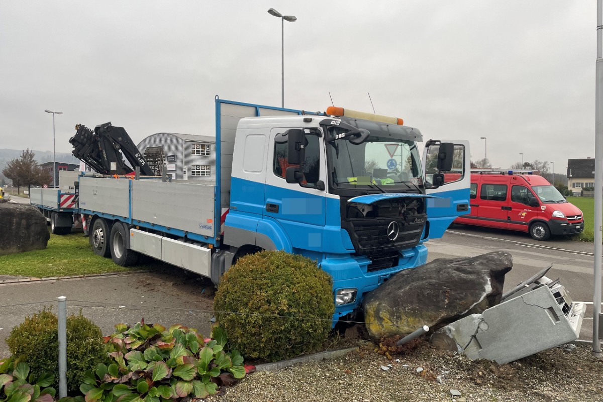 Kurz nach 15.30 Uhr war gestern ein 49-jähriger Lastwagenchauffeur in Müllheim von der Autobahn kommend in Richtung Kreisel Strassäcker unterwegs. Aus noch unbekannten Gründen verlor er bei der Ausfahrt aus dem Kreisel die Kontrolle über sein Fahrzeug. Dabei kollidierte er auf der Gashausstrasse mit einem Elektroverteilkasten und einem Findling. Der Chauffeur wurde verletzt und musste mit dem Rettungsdienst ins Spital gebracht werden. Es entstand Sachschaden von mehreren zehntausend Franken.