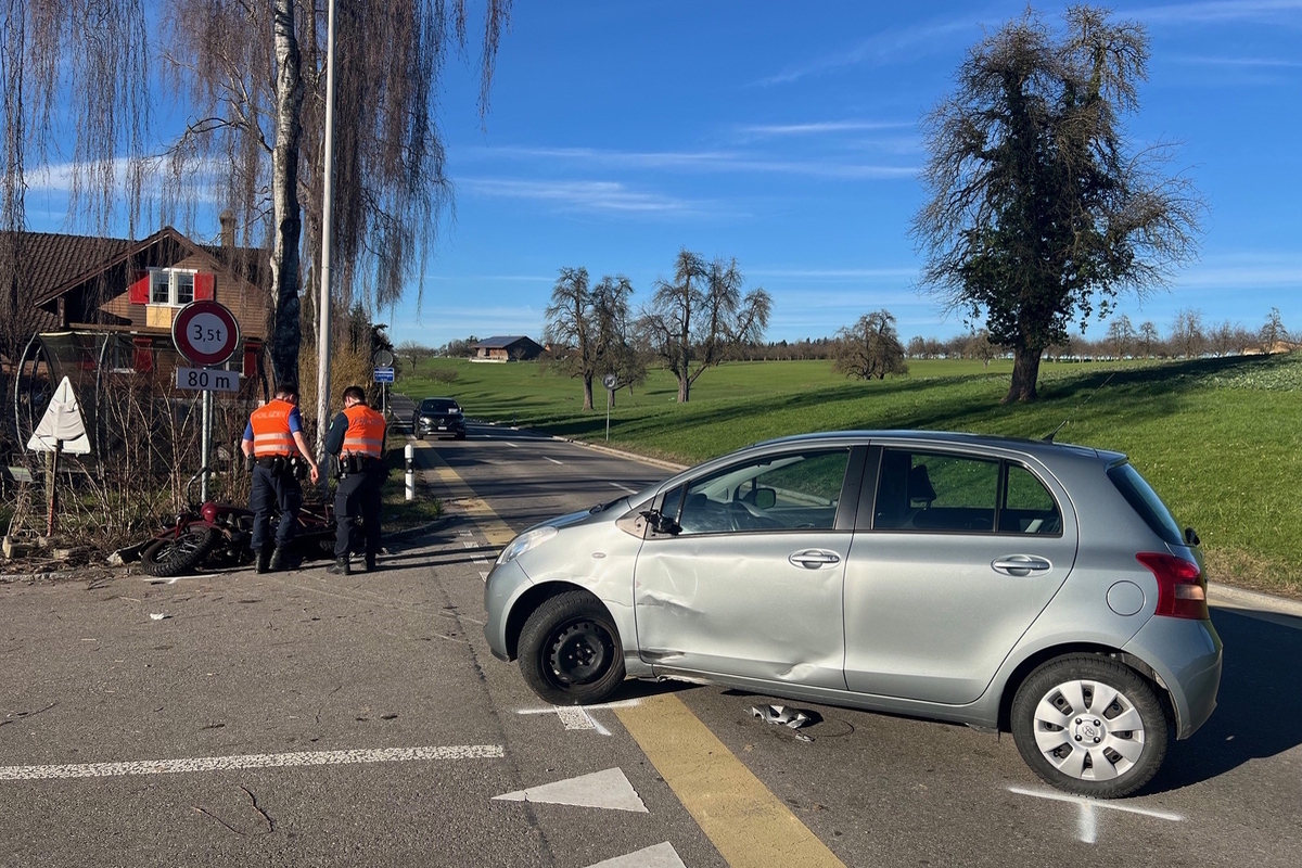 Folglich kam es zur Kollision zwischen dem Motorrad und dem Auto. Durch den Aufprall stürzte der Motorradfahrer und wurde unbestimmt verletzt. Die Rega flog ihn ins Spital. Die Autofahrerin wurde durch die Kollision ebenfalls unbestimmt verletzt. Sie wurden durch den Rettungsdienst ins Spital gebracht. An den Fahrzeugen entstand Sachschaden von mehreren tausend Franken.