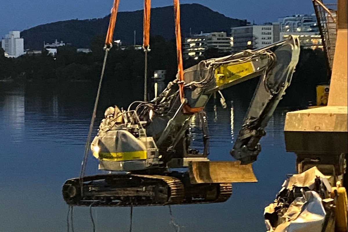der Bagger ins Schwingen, löste sich aus der Kranhalterung und stürzte via Ponton in den