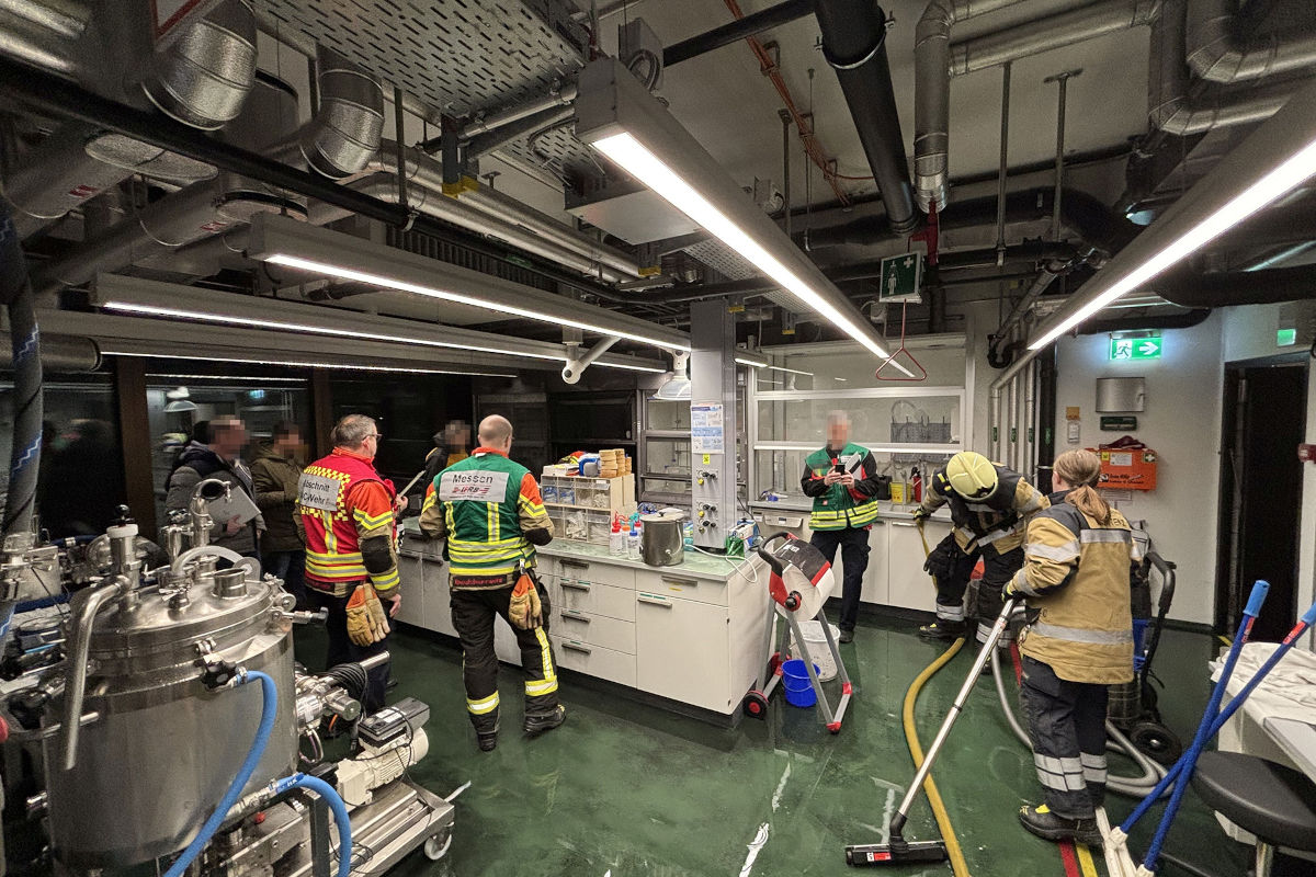 Durch die Einsatzkräfte konnte der Alarmeingang schnell in einem Chemielabor im ersten Obergeschoss des Gebäudes lokalisiert werden. Dort war durch das Erwärmen von Epoxidharz in einer Versuchskapelle ein Brand entstanden.