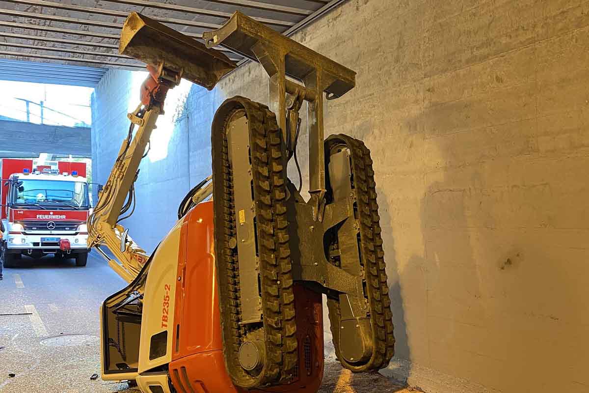 Auf der Ladebrücke seines Lastwagens hatte er einen Dumper sowie einen Kleinbagger geladen. Bei der Einfahrt in die SBB-Unterführung Rothausstrasse streifte der Baggerarm die Tunneldecke. Dabei wurde der Bagger von der Ladebrücke gerissen und blieb auf der Fahrbahn liegen.