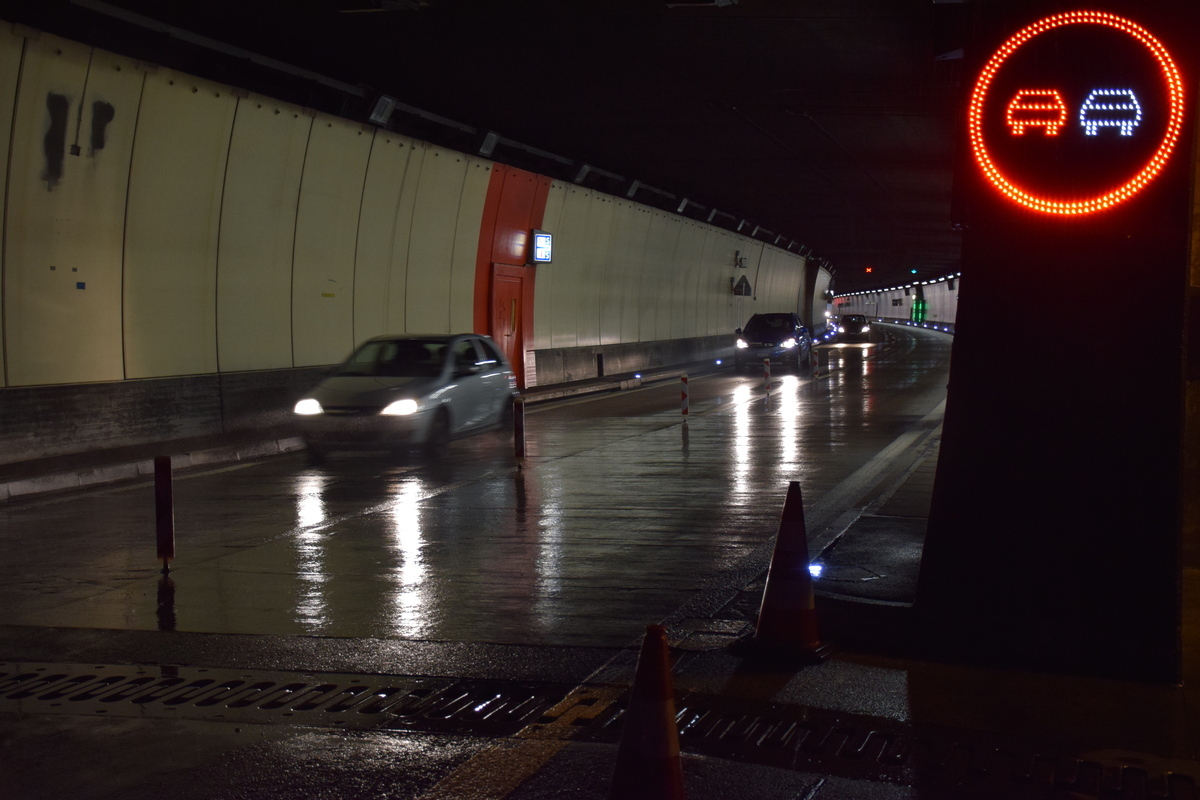 Während den Unterhaltsarbeiten ist eine Röhre gesperrt, in der anderen Röhre herrscht Gegenverkehr (Bildquelle: Amt für Betrieb Nationalstrassen)