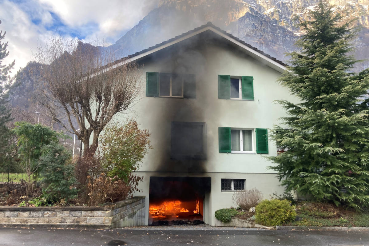 Der Brand ereignete sich aus noch ungeklärten Gründen in der Garage eines Einfamilienhauses. Die Hausbewohner sowie Anwohner hatten Flammen und starke Rauchentwicklung bemerkt, woraufhin sie den Feuerwehrnotruf verständigten. Die Einsatzkräfte der Feuerwehr Glarus konnten den Brand rasch unter Kontrolle bringen, unterstützt durch den Hubretter Weesen. Ein 77-jähriger Hausbewohner wurde wegen Verdachts auf Rauchgasvergiftung zur Kontrolle ins Kantonsspital Glarus gebracht. Der Sachschaden konnte noch nicht beziffert werden.