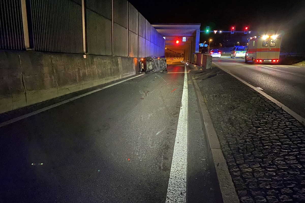 Verkehrsinsel. Durch den Aufprall kippte der rote Smart auf