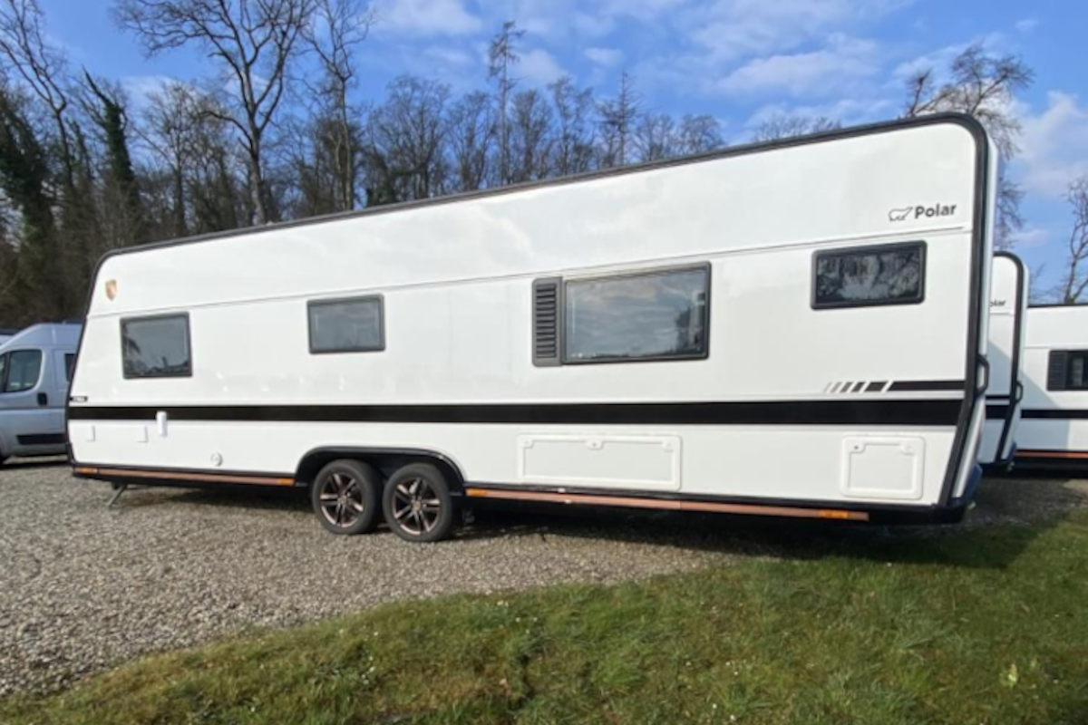 Der Wohnwagen der Marke Polar (Modell Chimera) ist weiss mit schwarzen Streifen auf beiden Seiten. Auf der Rückseite ist zudem ein grosser, bronzefarbiger Aufkleber mit einem Bären sowie dem Schriftzug "CHIMERA BY POLAR" angebracht.