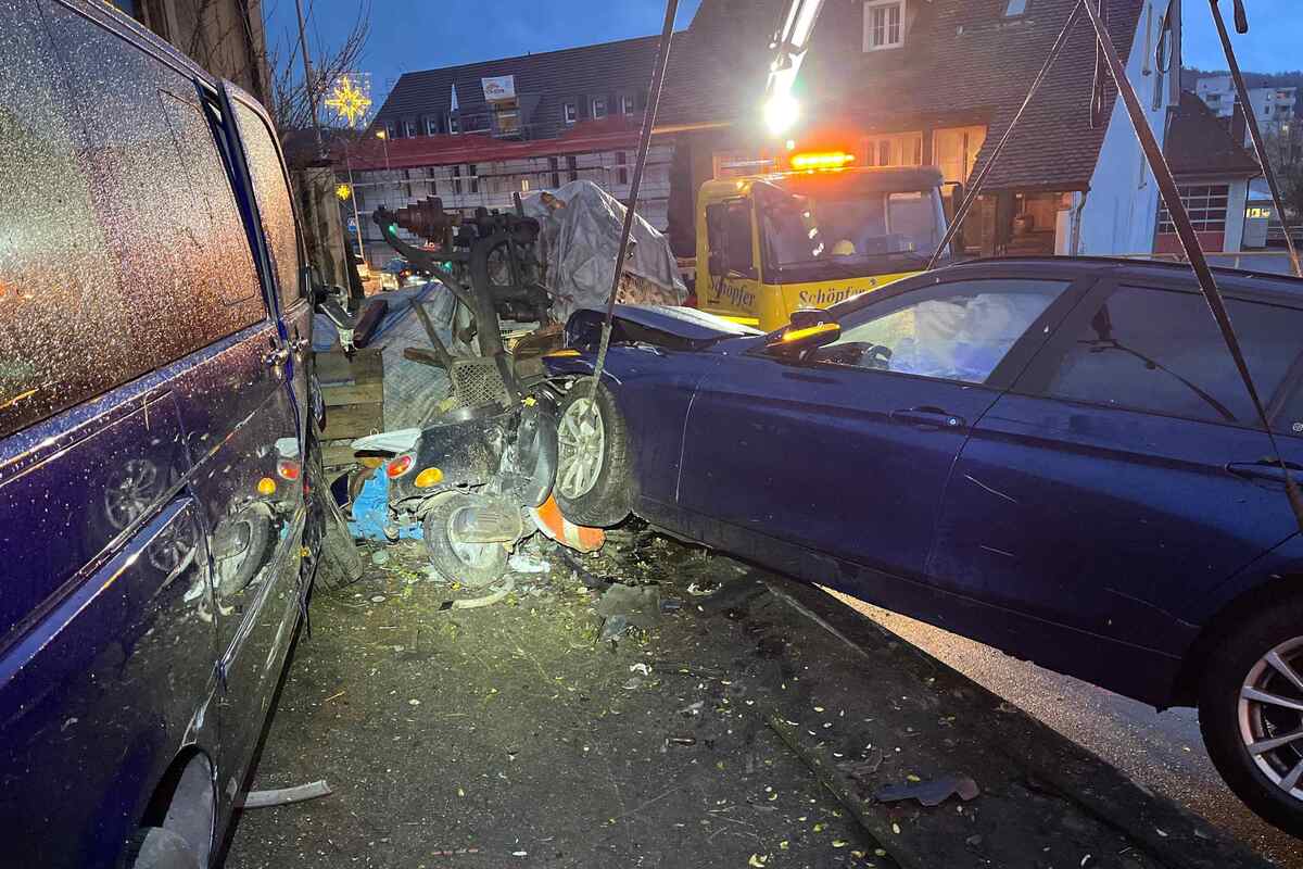 In der Folge kollidierte er mit seinem Auto unter anderem mit einer Grundstücksmauer, einem Baum, drei parkierten Fahrzeugen und mehreren Gegenständen, die auf dem Platz vor einem Haus abgestellt waren. Die Beifahrerin zog sich leichte Verletzungen zu und wurde zur Kontrolle in ein Spital gebracht. Das Fahrzeug wurde von einem Abschleppdienst mit Kran geborgen.