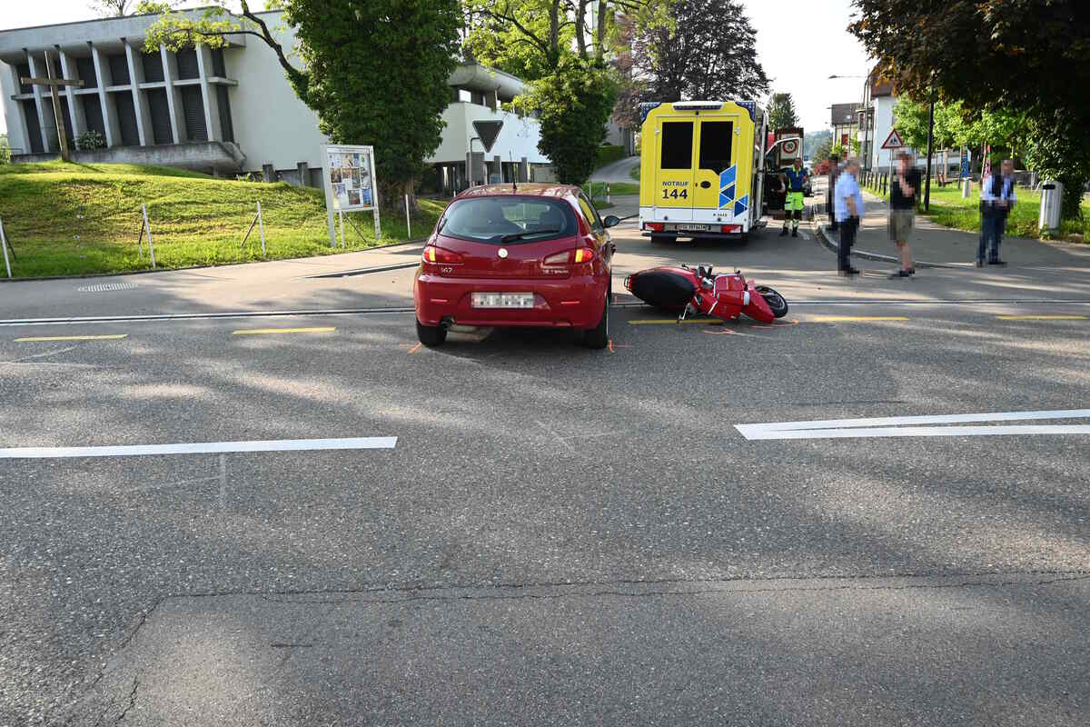 Am Sonntag (28.05.2023), kurz vor 17:45 Uhr, sind auf der Bahnhofstrasse, Höhe Einmündung Kirchstrasse, ein Auto und ein Roller zusammengestossen. Eine 58-jährige Rollerfahrerin wurde dabei unbestimmt verletzt. Der Rettungsdienst bracht die Frau ins Spital.