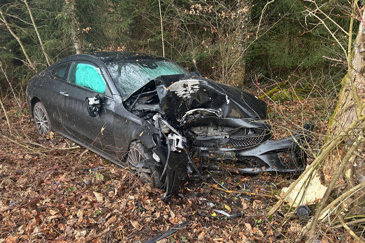 Das Fahrzeug geriet links von der Fahrbahn ab und prallte heftig gegen einen Baum. Ersthelfer bargen den Verunfallten aus dem stark beschädigten Auto.