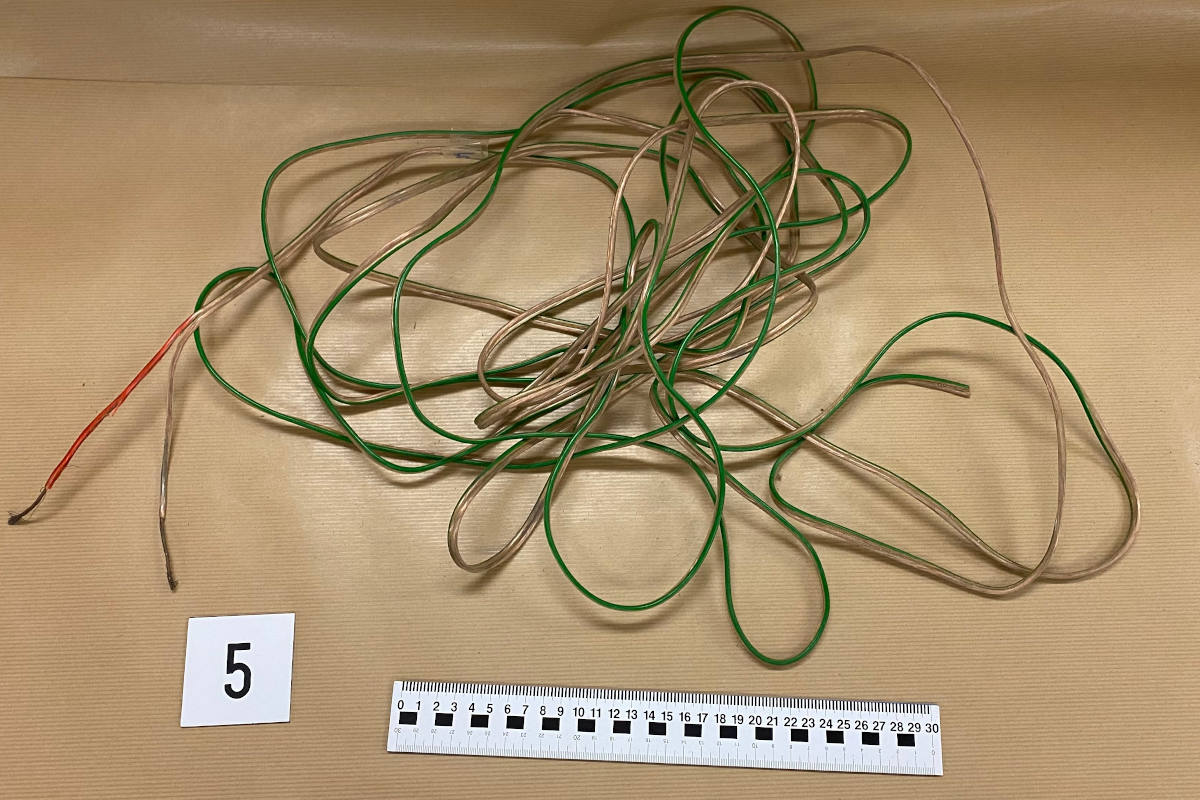 Vor Ort konnten, von der Täterschaft verwendete, einseitig grüne Lautsprecherkabel aufgefunden werden. Es handelt sich um vier Kabel mit einer Länge von total ca. 40 m. Der Litzendraht-Durchmesser dürfte ca. 2 – 2.5 mm betragen.