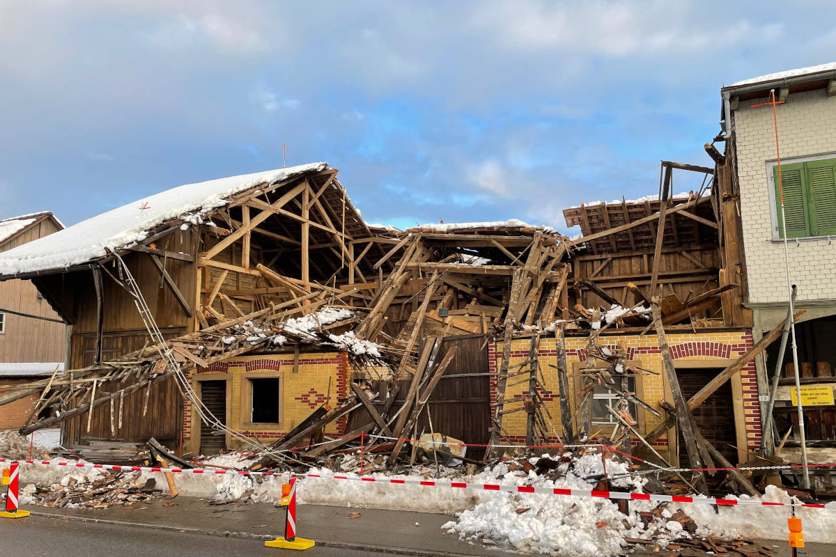 Von einem Passanten erhielt die Kantonspolizei St.Gallen die Meldung, dass die angebaute Scheune einer Liegenschaft eingestürzt sei. Die ausrückenden Patrouillen fanden das beschädigte Gebäude und Trümmerteile desselbigen auf der Strasse vor. Die Scheune wurde umgehend abgesperrt.