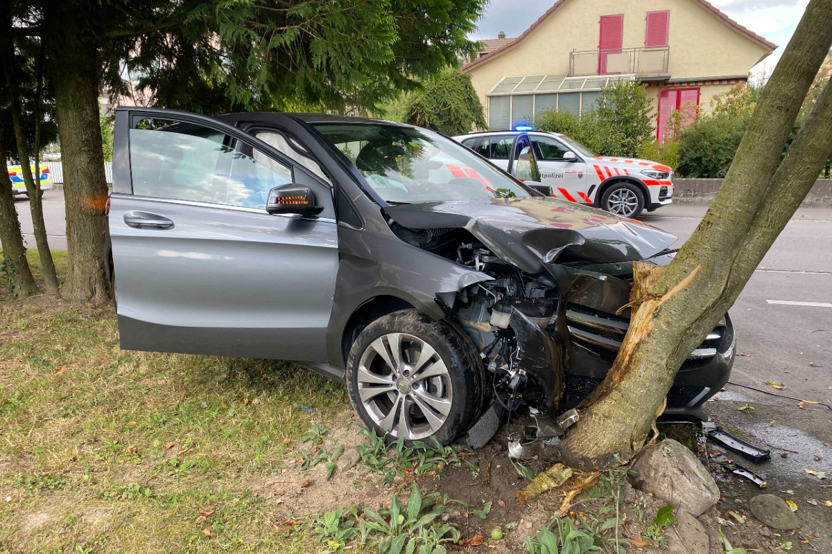 In einem Quartier in Oberentfelden kollidierte eine PWLenkerin mit einem Baum. Die Lenkerin wurde mit einer Ambulanz ins Spital überführt. Am Fahrzeug entstand Totalschaden.