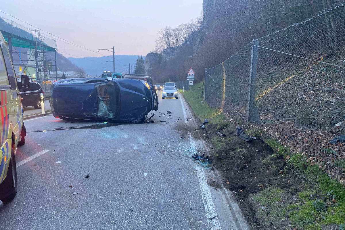 Bei Unfall in Oensingen kippte ein Auto auf die Seite (Bildquelle: Polizei Kanton Solothurn)