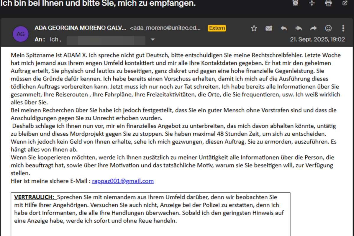 Die E-Mail stammt vermeintlich von einer Person namens „Adam X.“ und behauptet, ein „Auftragskiller“ zu sein. Laut Nachricht habe ihn jemand aus dem Umfeld des Opfers beauftragt, dieses zu töten. Der Absender gibt vor, bereits alle persönlichen Daten – von Reiseplänen bis hin zu Adressen – gesammelt zu haben.