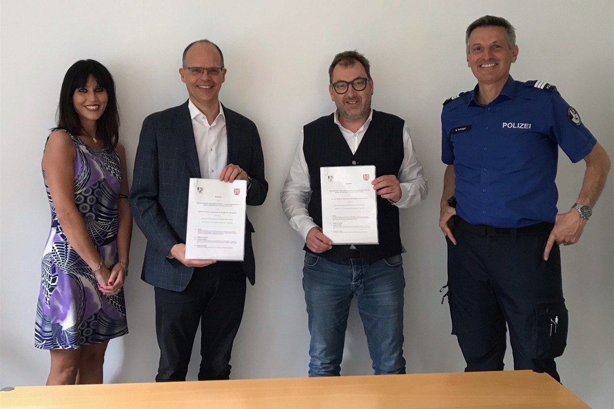 (v.l.) Stv. Gemeindeschreiberin Emilia Tosio, Gemeindepräsident Giovanni Jochum, Regierungsrat Peter Peyer, Polizeikommandant Walter Schlegel (Bildquelle: Kantonspolizei Graubünden)