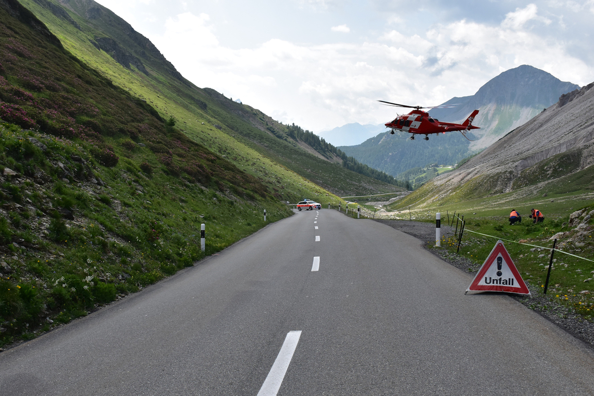 Ein 55-Jähriger überholte kurz vor 11 Uhr auf der Forcola-di-Livigno-Strasse mehrere Autos. Dabei wurde er von einem aus der Kolonne leicht nach links ausscherenden Auto überrascht. Aufgrund dieser Situation leitete er eine Vollbremsung ein, geriet links neben der Fahrbahn in ein Kiesbett und stürzte. Dabei zog er sich leichte Verletzungen zu und wurde zu weiteren Abklärungen mit der Rega ins Spital nach Samedan geflogen.