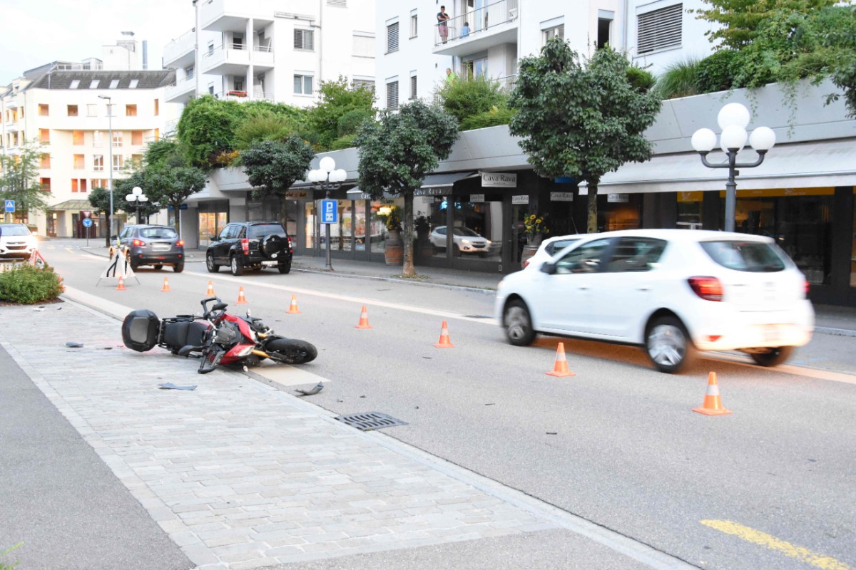 Am Montagabend (17.08.2020), um 19:50 Uhr, ist auf der Allmeindstrasse ein Motorrad in ein Auto geprallt. Der 33-jährige Motorradfahrer wurde unbestimmt verletzt.