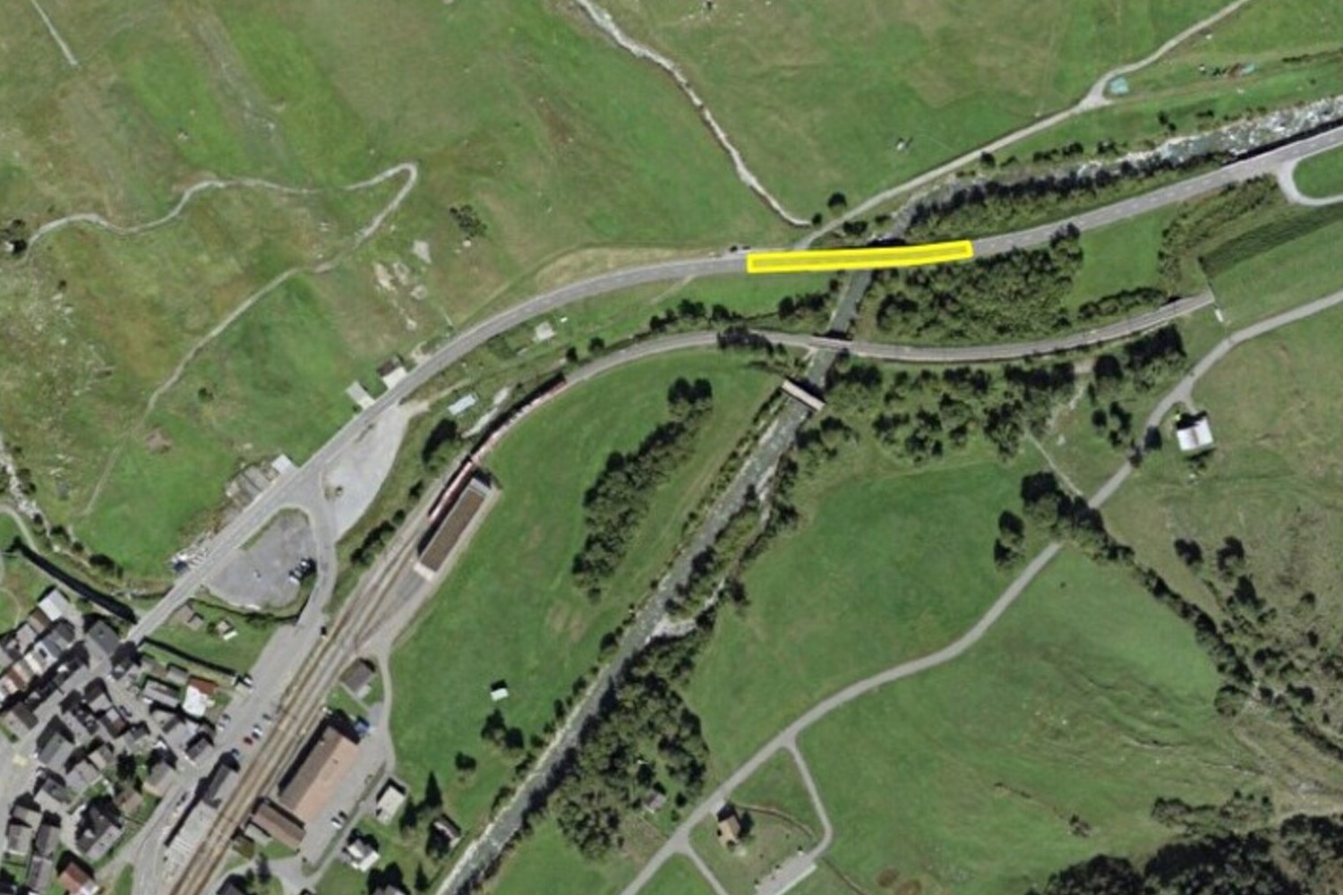 Die Reussbrücke (gelb markiert) am Dorfeingang von Realp wird während sechs Monaten saniert (Bildquelle: Baudirektion Uri)