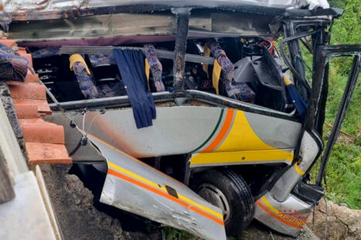 Derzeit regnet es in der Gegend intensiv. Der Bus durchbrach die Brüstung, die die Strasse abgrenzt, und landete an der Hauswand. Rettungskräfte und die Polizei sind noch vor Ort.