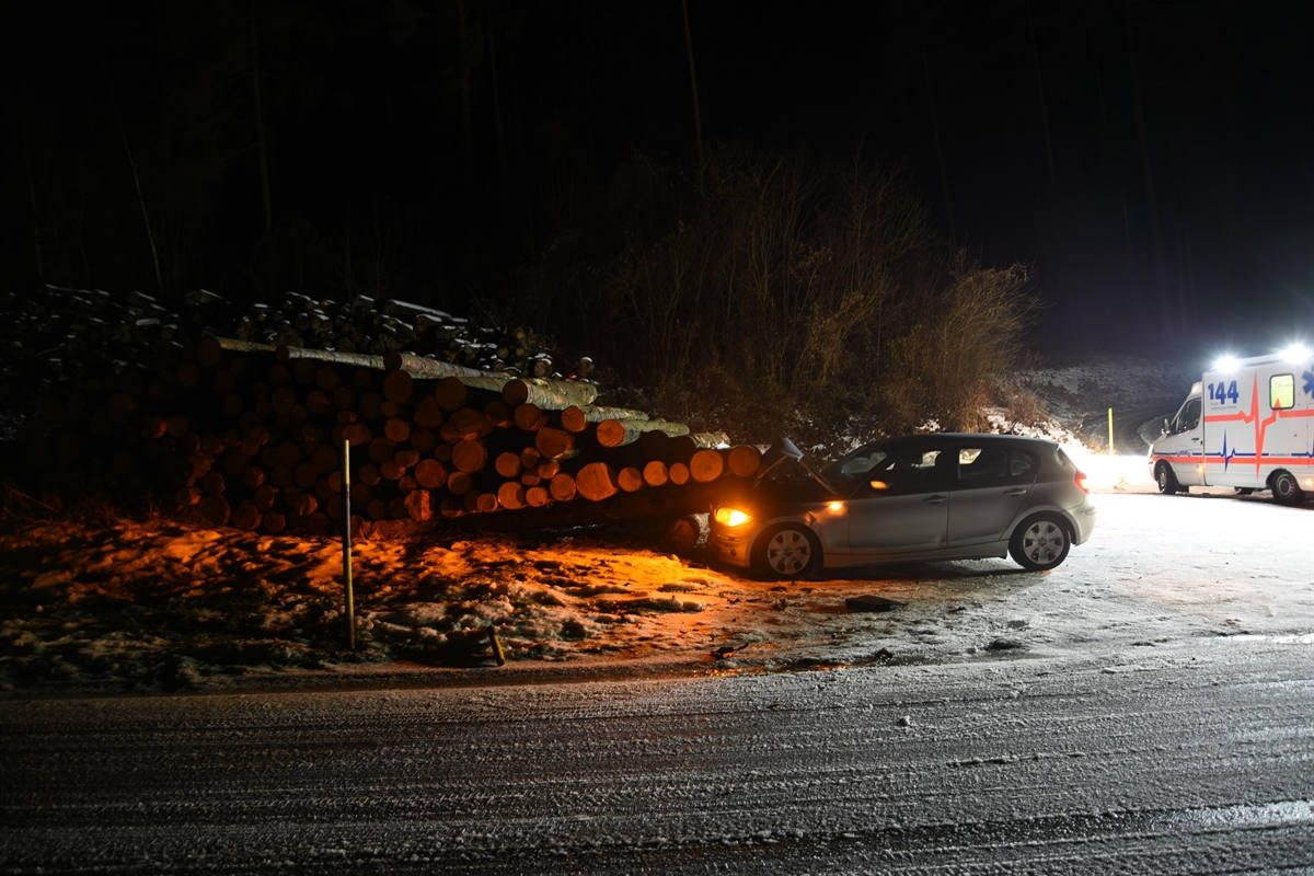 Eine 22-jährige Personenwagenlenkerin fuhr zusammen mit drei Kollegen um 4 Uhr morgens auf der Italienischen Strasse von Rhäzüns in Richtung Rothenbrunnen. In einer Linkskurve rutschte das Fahrzeug auf der vereisten Strasse geradeaus über einen Holzlagerplatz und prallte in die dort gelagerten Baumstämme.